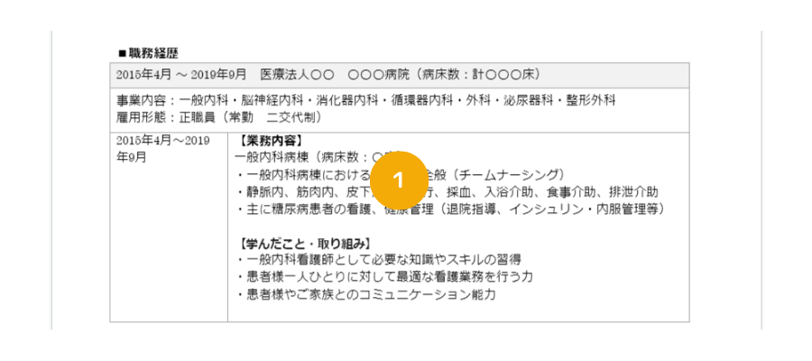 「病院名:○○」「病院概要:総合病院」「病床数○○床」「従業員○○人」といったように、働いた職場の規模が分かるように記載